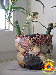 Алинка очень любит что-нибудь придумывать, клеить. Вот придумала украсить горшочек для цветов из ракушек, которые сама же и насобирала на море. Клеила на пластмассовый горшочек клеем ПВА. Лучший подарок для мамы.